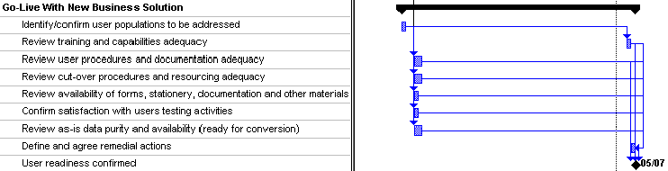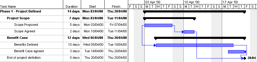 Note that this particular style of diagram is not very good at telling us about the nature of the dependencies. As you saw in the Gantt chart, the various pieces of work deliberately overlap, eg we can start looking at benefits before the scope has been fully defined. In fact, it has "Start-Start" dependencies and "Finish-Finish" dependencies as well as the traditional "Finish-Start" links. In some styles of chart, this would be made more clear, for example, by showing the connecting line going to the end of the box if it means "Finish" or the start of the box if it means "Start".